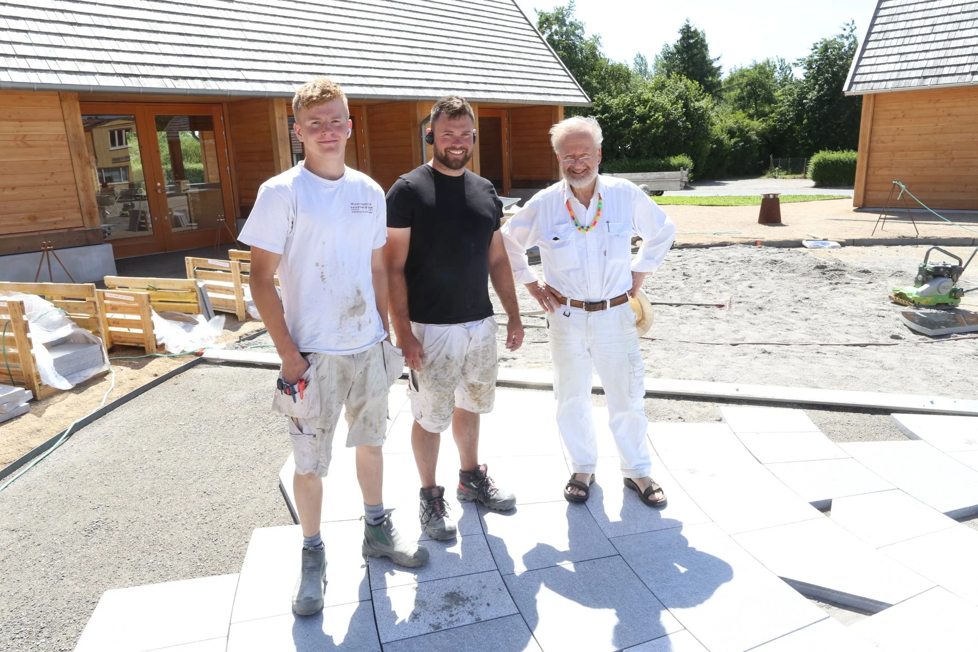 Granitbelægningen var færdig i juli. Her står Bjørn Nørgaard på pladsen sammen med Buster og René fra holdet, der lagde de mange sten.